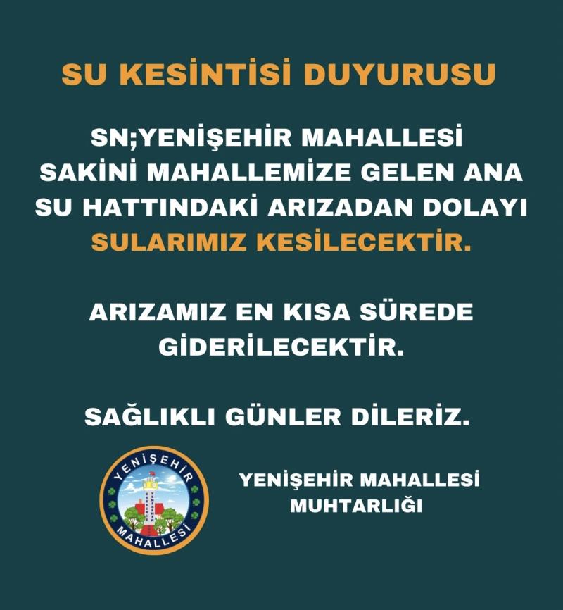 SAKİNİ MAHALLEMİZE GELEN ANA SU HATTINDAKİ ARIZADAN DOLAYI SULARIMIZ KESİLECEKTİR.