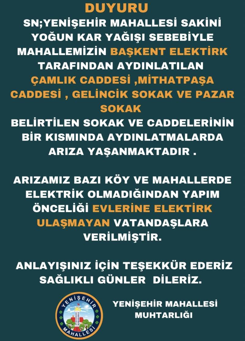 SN;YENİŞEHİR MAHALLESİ SAKİNİ YOĞUN KAR YAĞIŞI SEBEBİYLE MAHALLEMİZİN BAŞKENT ELEKTİRK TARAFINDAN AYDINLATILAN